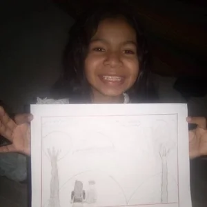 I made some drawings that the school sent as homework. It was about the rural area and the urban area. Right now I am with my little cousin. We took care of him while we made faces for him to laugh, and I gave him my stuffed animals. I played with him for a while.